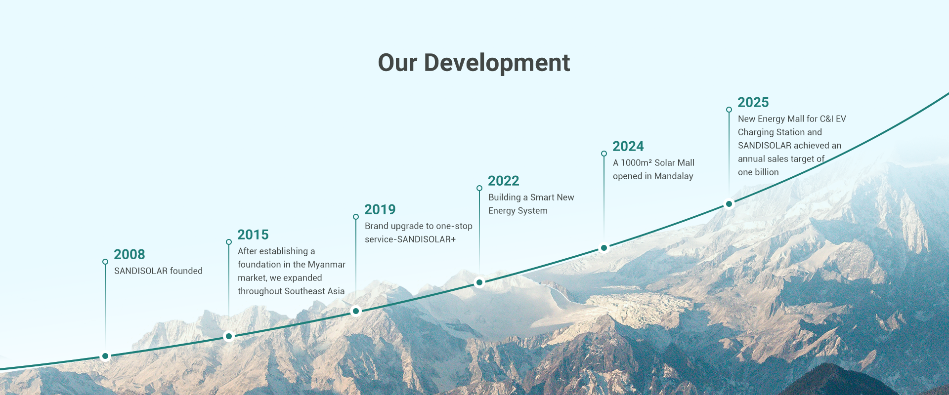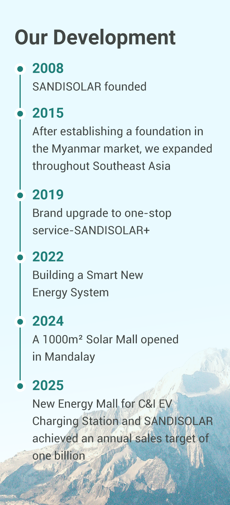 サンディソーラーは 2008 そして研究においてはハイテク企業です, 発達, 生産, また、太陽光発電モジュールなどの製品の販売も含まれます, インバーター, 電池, エネルギー, 貯蔵システム, EV充電, および新エネルギーの応用. 業界をリードする製品とインテリジェントなエネルギー管理システムを活用する, 当社はミャンマーとタイの新興エネルギー市場に進出しています, 数え切れないほどの世帯や工業施設を提供しています & 商業企業:全域をカバーするワンストップ統合エネルギーソリューション "太陽光蓄電充電" スペクトラム—真に何千もの工場にクリーンエネルギーをもたらす.